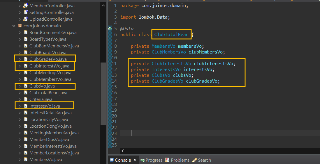 ClubTotalBean 을 사용해서 내가 가져올 정보들이 있는 VO들을 넣어준다(롬복 사용)