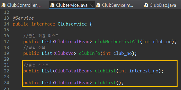 서비스에서 ClubTotalBean으로 List를 받는 메서드를 생성