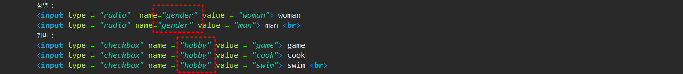 - 같은 속성을 가지게 하려면 name 을 같게 설정.