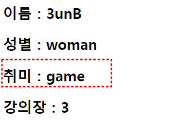 전달한 정보 저장 후 출력(이름, 성별, 취미, 강의장)
