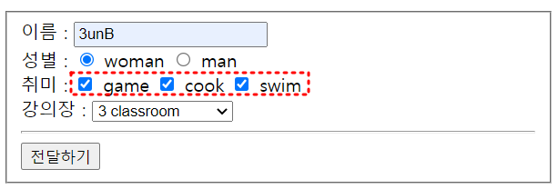 실행하면 정상적으로 체크한 취미만 전달된다.