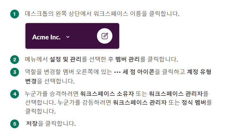 Slack에서는 모든 사람에게 역할이 있으며, 각자 자신만의 권한과 액세스 수준을 보유합니다. 각 역할 유형에 대한 구체적인 권한을 아래의 표에서 확...