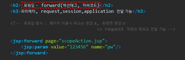 - 포워딩 방식 : 페이지 이동시 주소는 변경 x, 화면면 변경 o