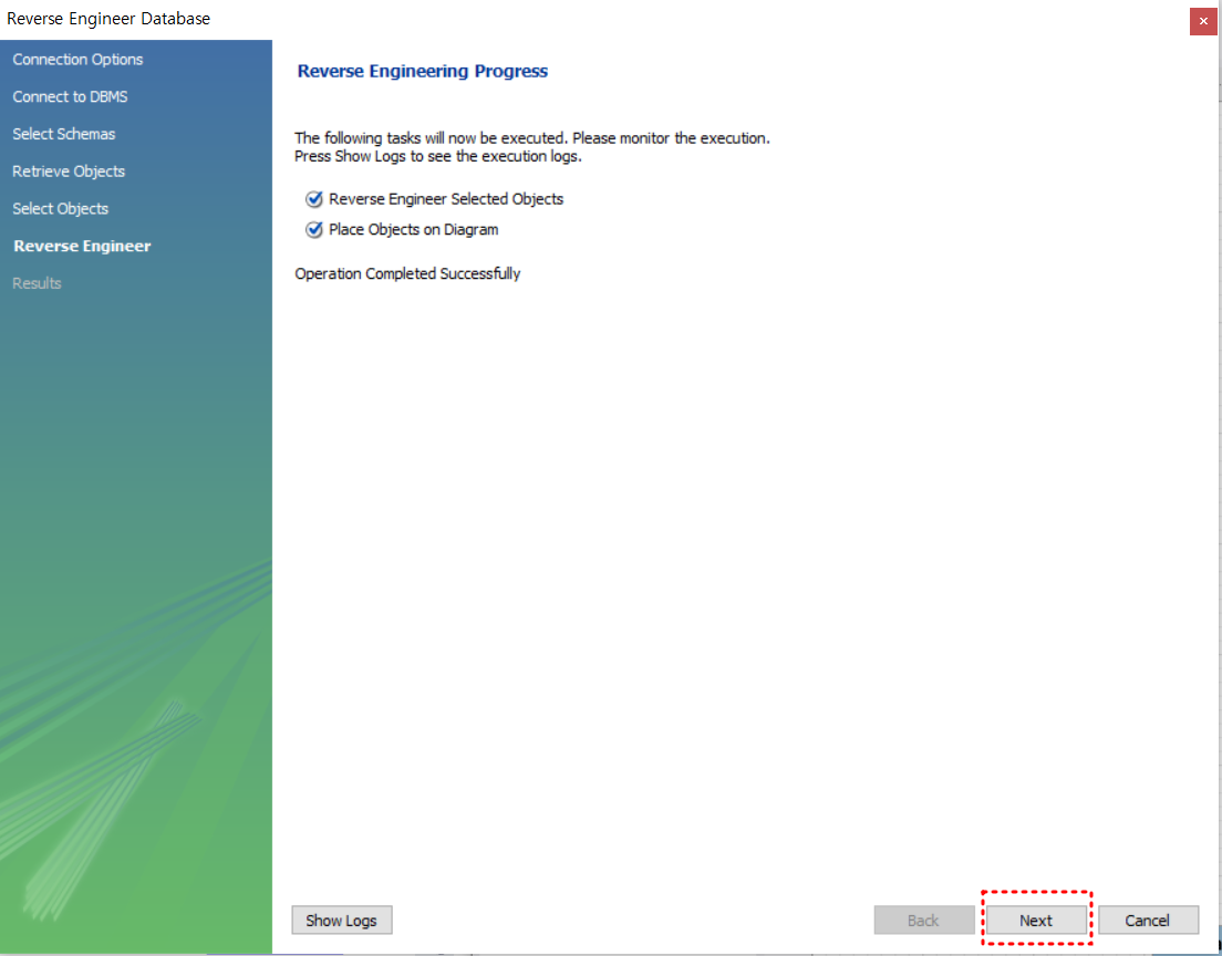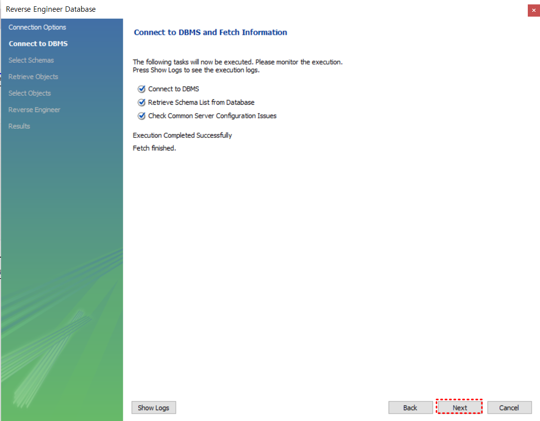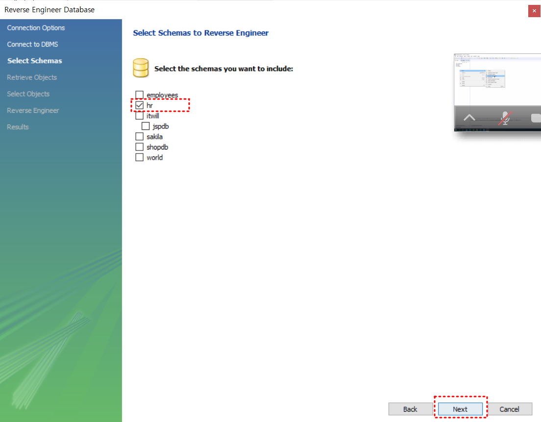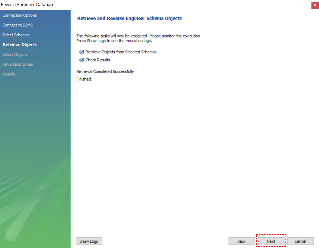 5. 선택한 스키마 확인 작업이 완료 되면 next