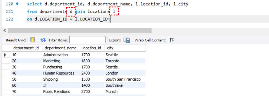 >> location_id컬럼은 두 테이블에 동일하게 존재하므로 테이블명을 접두어로 붙여줘야 함.