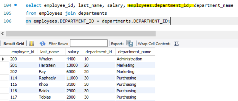 >> department_id 컬럼은 두 테이블에 동일하게 존재하므로 테이블명을 접두어로 붙여줘야 함.