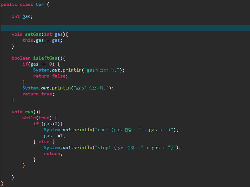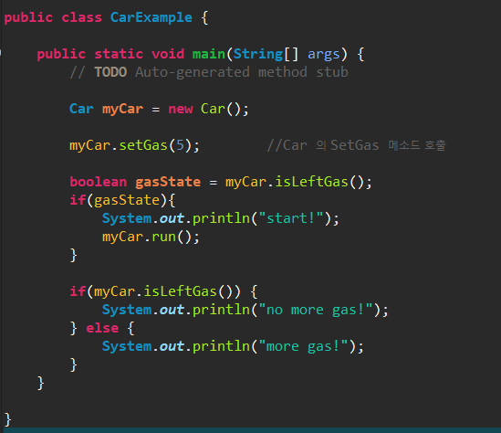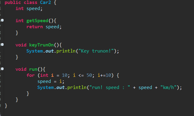 : 객체의 동작에 해당하는 실행 블록 void methodName() {....}