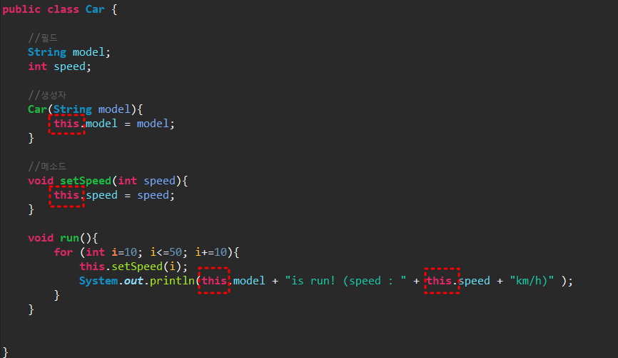 > 주로 생성자와 메소드의 매개변수 이름이 필드와 동일한 경우, 인스턴스 멤버인 필드임을 명시하고자 할 때 사용됨