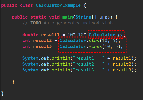 클래스가 메모리로 로딩되면 정적 멤버를 바로 사용할 수 있는데, 클래스 이름과 함께 .(도트 연산자)로 접근