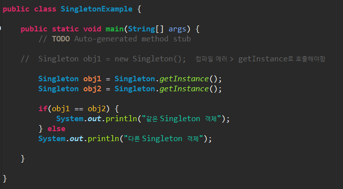 ⓑ 자신의 타입인 정적 필드를 하나 선언하고 자신의 객체를 생성해 초기화 함