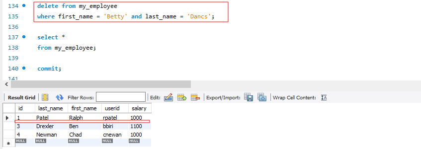 8. MY_EMPLOYEE 테이블에서 Betty Dancs란 사원을 삭제