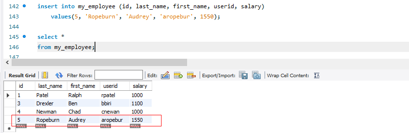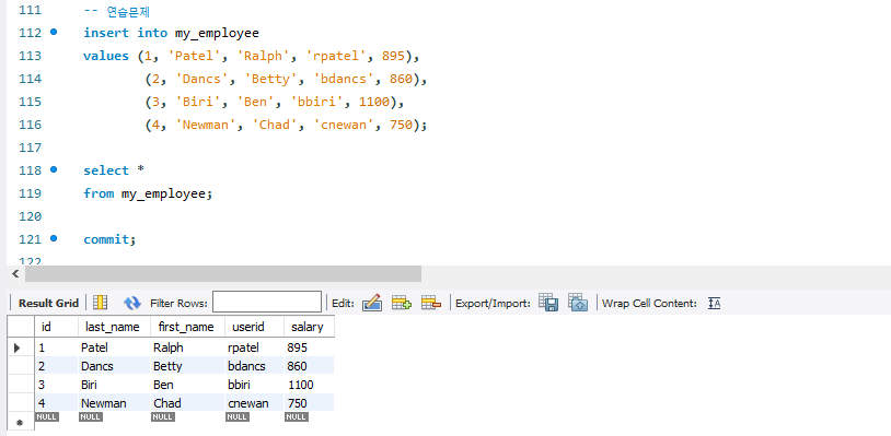 2. 다음 데이터를 MY_EMPLOYEE 테이블에 추가하는 INSERT문을 작성