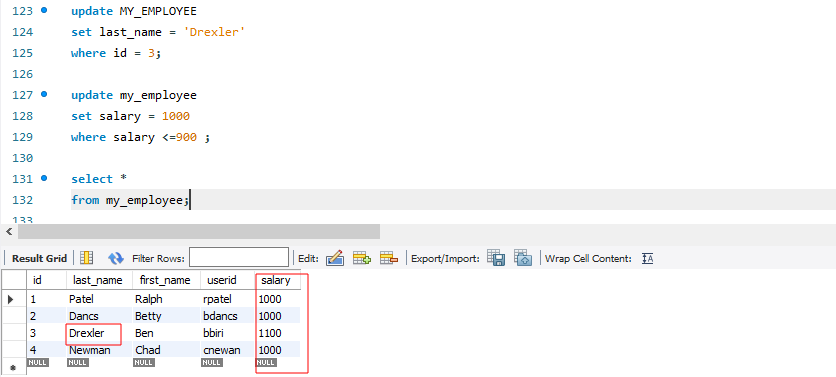5. ID가 3인 사원의 last_name을 Drexler로 변경