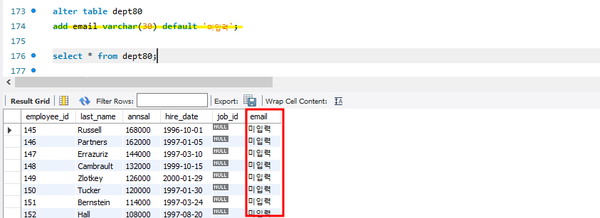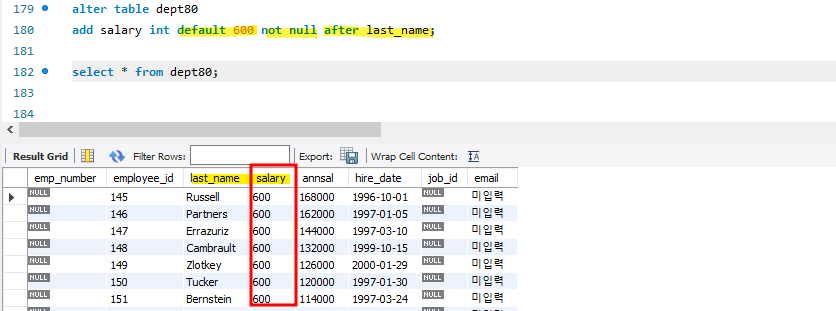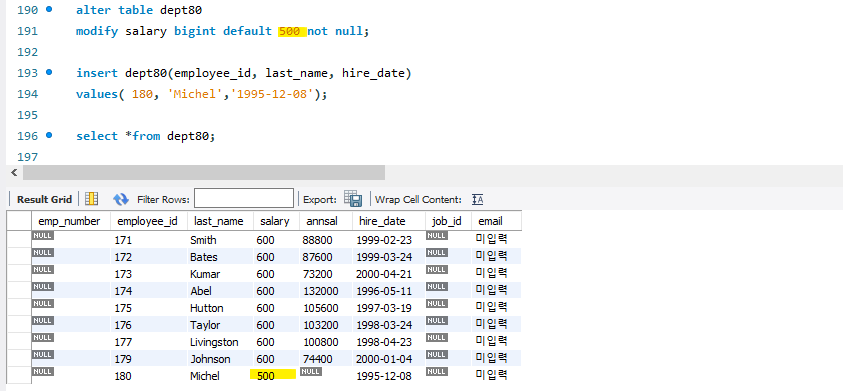 * default값 수정 시 이전에 등록된 데이터는 변경되지 않고 변경 이후 데이터 삽입 시 부터 적용됨