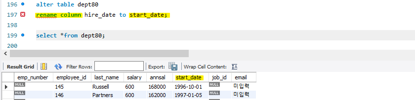 alter tabel 테이블 이름 rename column 예전 컬럼명 to 새로운 컬럼명