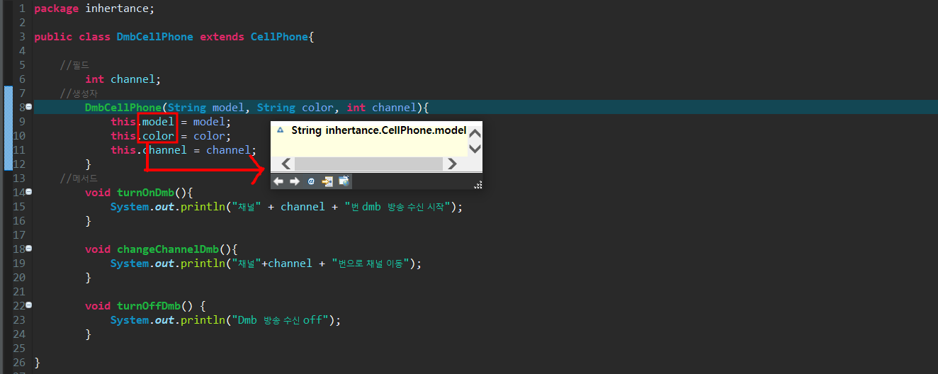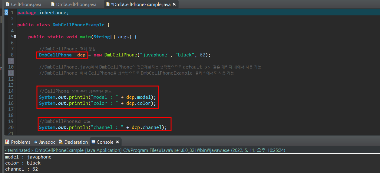 DmbCellPhone 에서 CellPhone을 상속받으므로 DmbCellPhoneExample 클래스에서도 사용 가능